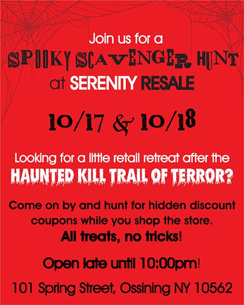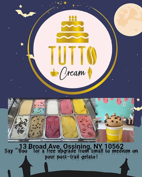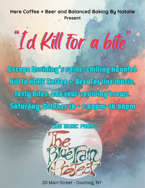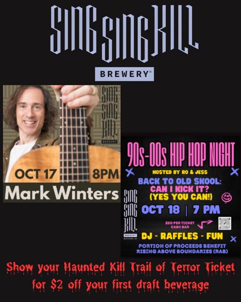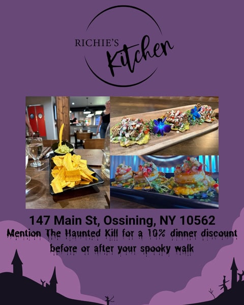 For 2025, the Haunted Kill Trail of Terror will run October 17th and 18th from 6pm – 10pm each night. The wider event is free, and includes access to food trucks, craft beer and cocktails, spooky tunes, a haunted art show, freak side show acts, an adult costume contest, and more. The haunted trail, recommended for ages 13+, costs $5 per person and is a ~20 minute guided tour through the Kill Brook Gorge. Tours will run from 6:30pm – 9:45pm. Local Ossining businesses are participating in various ways. Click here to jump down to specials.